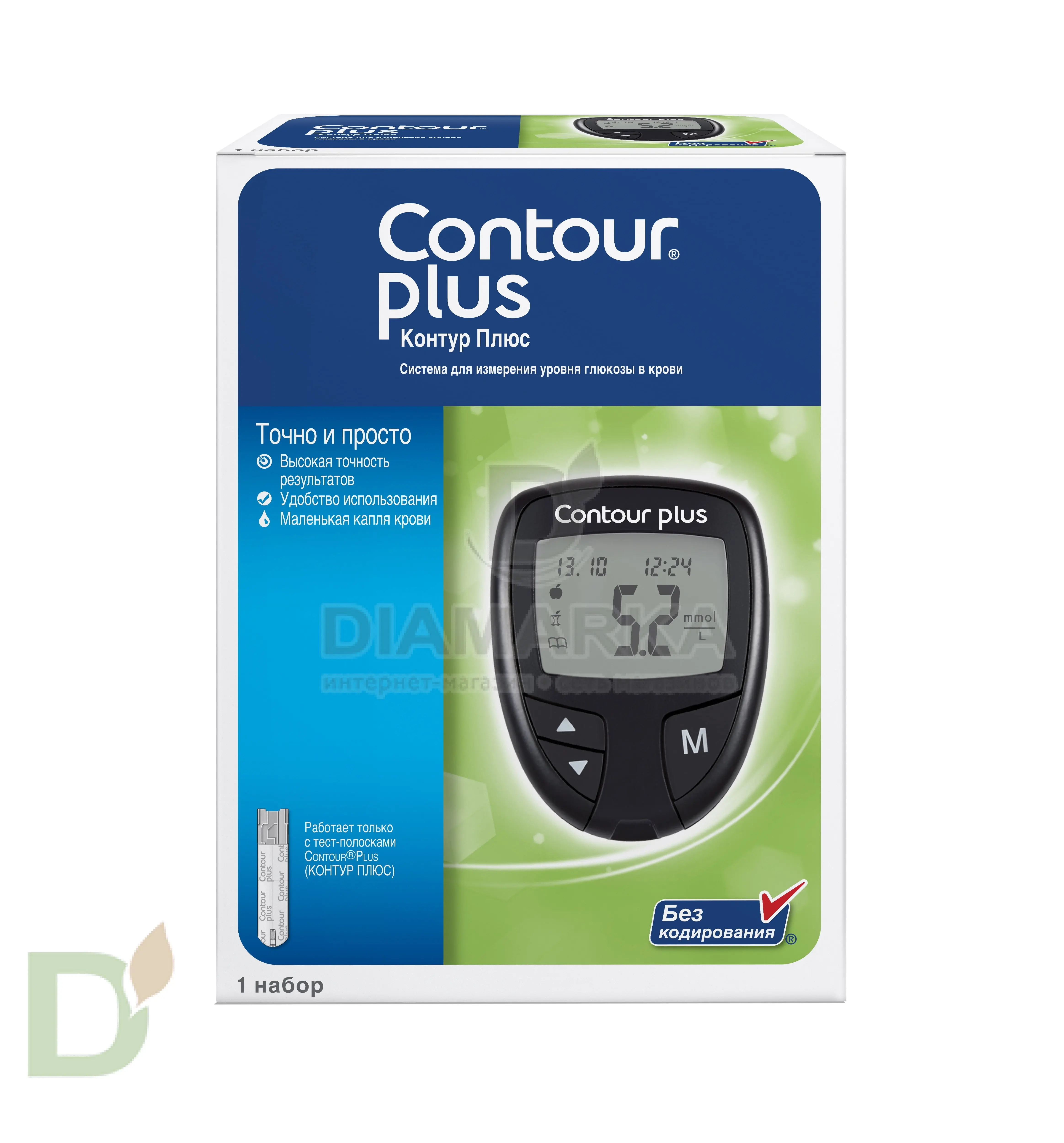 Важно! Использует только тест-полоски «Контур ПЛЮС». Тест-полоски «Контур ТС» к данному глюкометру не подходят.