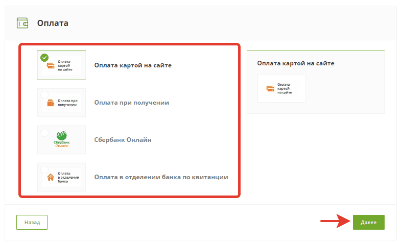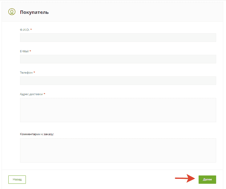 Заполните контактную информацию и оставьте комментарий к заказу, если это необходимо. После заполнения нажмите “Далее”: