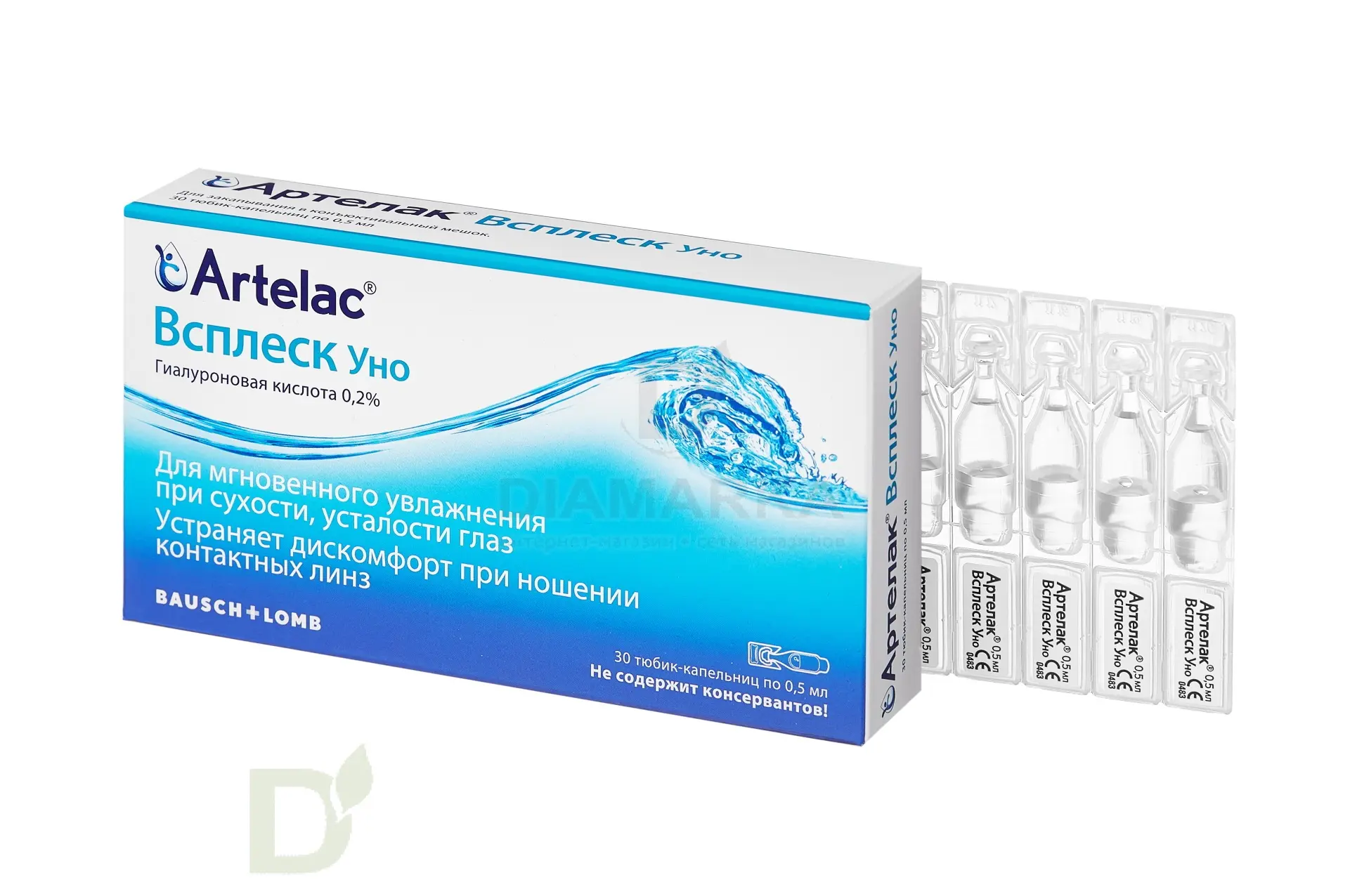 <h2>Схожий с натуральной слезой состав</h2> В составе средства Артелак Всплеск Уно гиалуроновая кислота, которая является естественным увлажняющим веществом. Капли помогают восстановить слезную пленку на роговице глаза, тем самым устранив чувство раздражения, сухости, ощущение инородного тела в глазу.<br> <h2>Подходит для использования с линзами</h2> Всплеск Уно может использовать как офтальмологические капли для увлажнения, а также как средство, которое дополнительно заботится о здоровье глаз при ношении КЛ. <br> <h2>Рекомендации по применению</h2> В конъюнктивальный мешок по 1 капле в каждый глаз. От 3 до 5 раз в день или по необходимости. <h2>Противопоказания</h2> Гиперчувствительность к любому из компонентов раствора (местные аллергические реакции, возникающие в редких случаях). В таких случаях следует прекратить применение раствора.