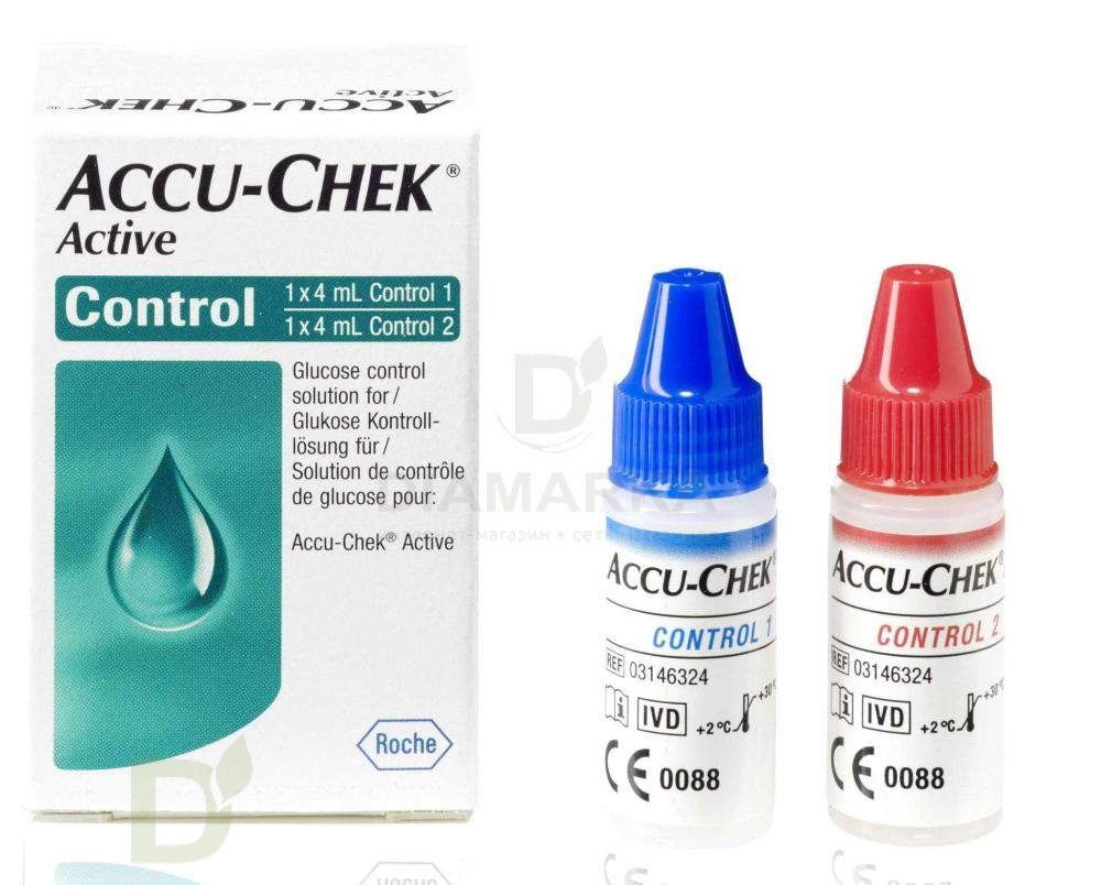 <p> Контрольный раствор для проверки Глюкометра Акку-Чек Актив. </p> <p> В наборе 2 пузырька по 4 мл, с низкой концентрацией глюкозы (Control 1) и высокой концентрацией (Control 2), инструкция. </p> <p> Способ применения: </p> <ol> <li>Вставьте тест-полоску в глюкометр.</li> <li>Убедитесь в том, что код на экране совпадает с кодом на тубе тест-полосок.</li> <li>Когда раздастся звуковой сигнал и появится изображение капли крови на экране, у вас есть 90 секунд, чтобы нанести контрольный раствор на тест-полоску.</li> <li>Протрите кончик флакона сухой салфеткой и нанесите крупную каплю на зелёное поле тест-полоски, как вы бы нанесли кровь.</li> <li>Сверьте результат контрольного измерения с таблицей.</li> </ol> <p> <strong>Совет:</strong> результат контрольного измерения остаётся в памяти глюкометра. Чтобы не запутаться, рекомендуем маркировать измерение (см. с.23 руководства, раздел "Маркировка результатов измерений"). </p> <p>   </p> <p>   </p> <p>   </p>