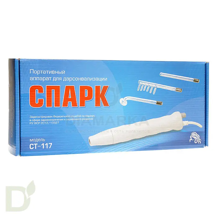 <h2>Физиотерапия на дому с прибором Дарсонваль</h2> Универсальный прибор для проведения домашних процедур физиотерапии. Принцип действия дарсонваля основан на высокочастотных импульсах электрического тока. Воздействуя на ткани, ток улучшает местное кровообращение, микроциркуляцию и питание. Что влечет за собой ряд положительных эффектов.<br> <br> <h3>Показания для дарсонвализации</h3> <ul> <li>лечение липогипертрофий</li> <li> акне, прыщи и прочие высыпания</li> <li> регенерация кожных покровов и ускорение заживления тканей</li> <li> активация роста волос</li> <li> фурункулы и гнойнички</li> <li> целлюлит, отеки и застойные явления</li> <li> устранение послеоперационных швов</li> <li> боли в спине, остеохондроз, невралгия</li> <li> варикоз</li> <li> гинекологические, урологические, респираторные воспалительные заболевания</li> <li> устранение боли в суставах, связках, мышцах</li> <li> дряблая и возрастная кожа, морщины</li> </ul> <b>Аппарат Спарк СТ-117 утвержден для реализации через систему фармдистрибуции РФ (регистрационное удостоверение Минздрава РФ № ФСР 2012/13527). </b><br> <h3>Дарсонваль от акне, облысения, целлюлита и воспалений</h3> В комплекте к прибору Дарсонваль Спарк СТ-117 идет 3 насадки-электрода:<br> <ol> <li>гребешковая - для кожи головы и волос</li> <li> грибок - универсальная насадка для лица и тела</li> <li> полостной - для проведения дарсонвализации в носовой или ушной полости</li> </ol> Питание от сети<br> <br> Гарантийный срок - 1 год