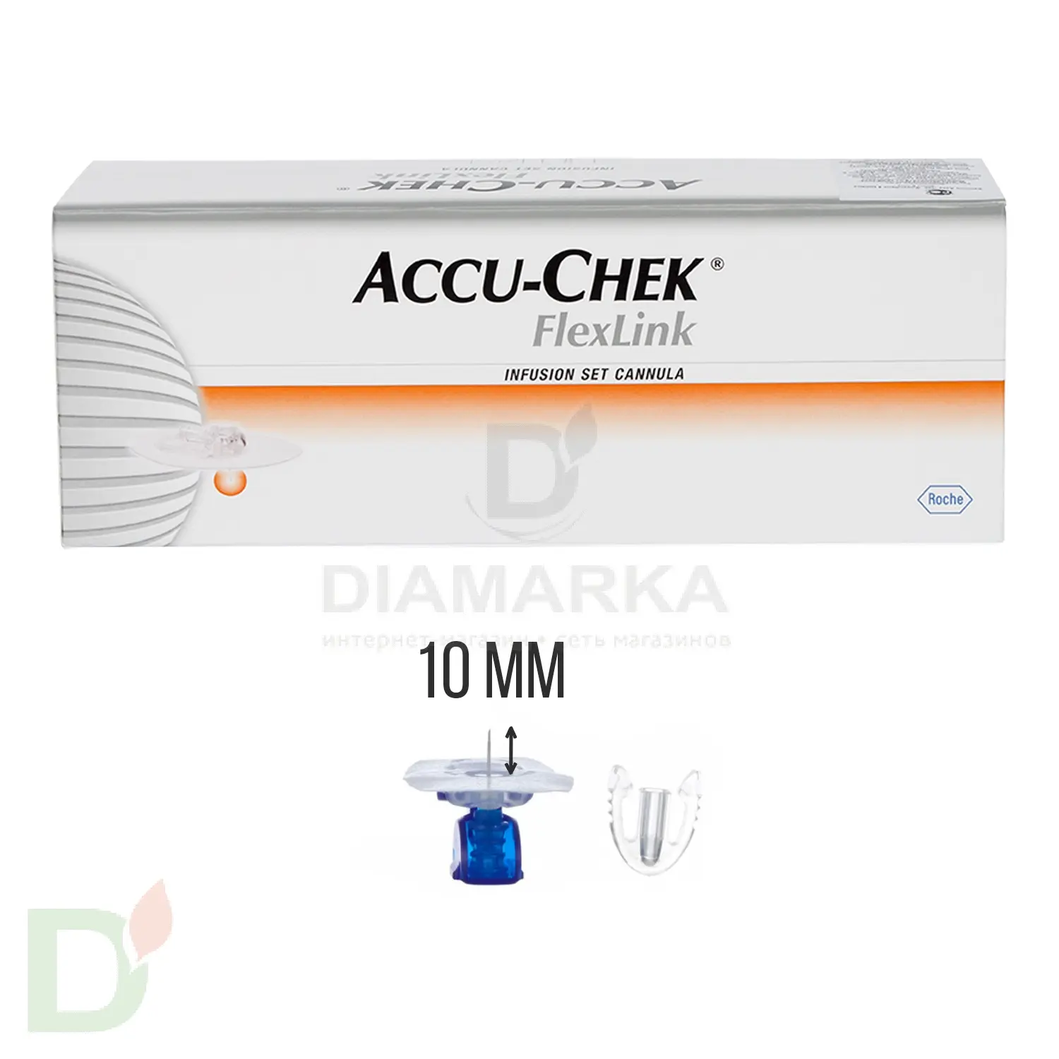 Игла Акку-Чек Флекс-Линк (Accu-Chek FlexLink), 10 мм (канюля) - это стандартная игла, которая подходит взрослым людям, либо детям с плотным телосложением. При необходимости можно выбрать канюлю (иглу) длиной 8 мм. Канюля, в большинстве случаев, вводится в кожу живота или ягодиц и  сопоставима по толщине с иглой шприц-ручки. Канюля имеет самоклеющееся основание, благодаря которому исключается самопроизвольное выпадение из кожи. Игла имеет мягкую тефлоновую подкожную канюлю. Металлическая игла извлекается после установки, поэтому неприятные ощущения при ношении полностью исчезают и значительно уменьшается вероятность возникновения раздражения на месте установки.