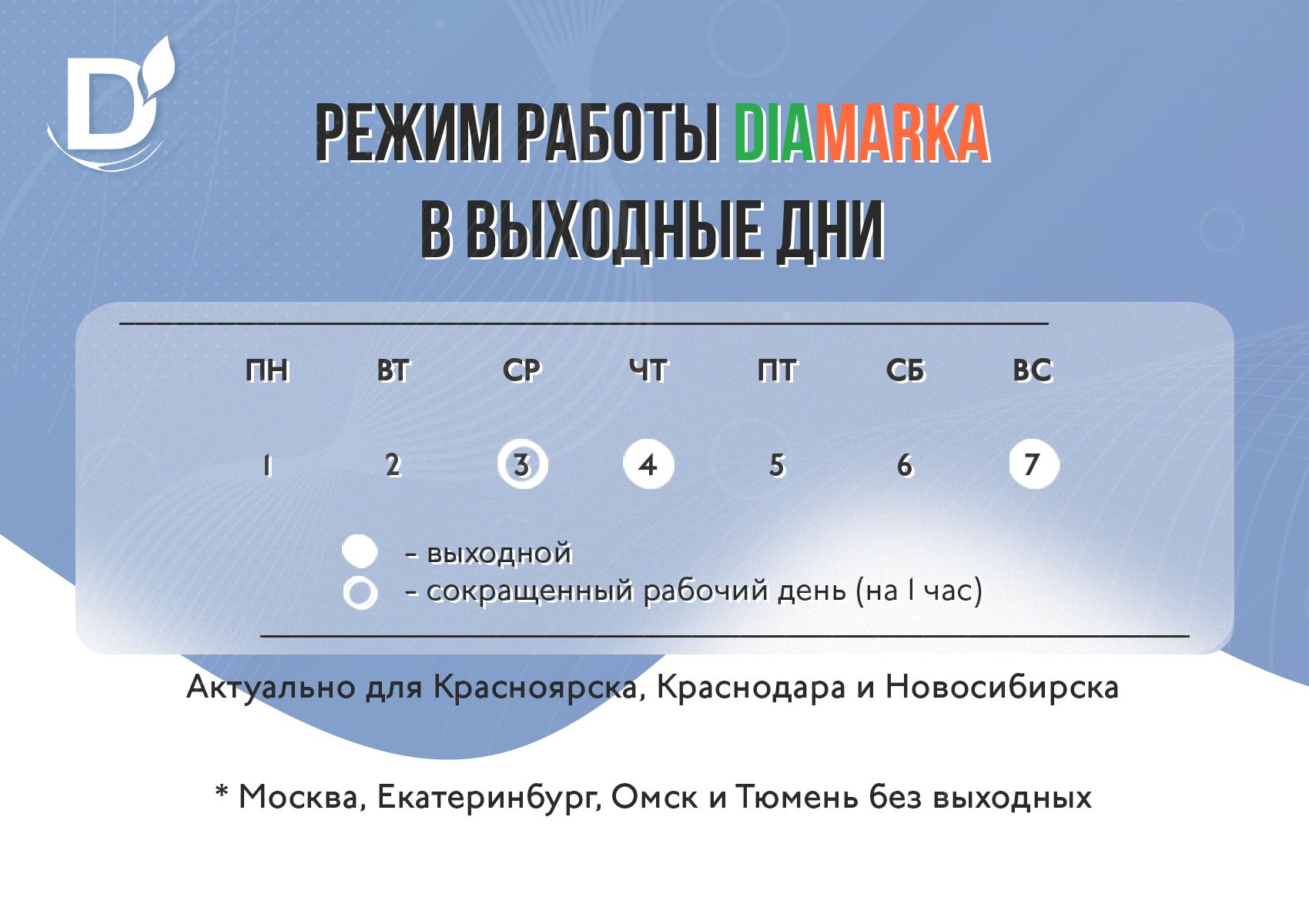 А выходные дни - это... классная возможность заняться шоппингом! Делимся с вами графиком работы DiaMarka в праздничные дни: