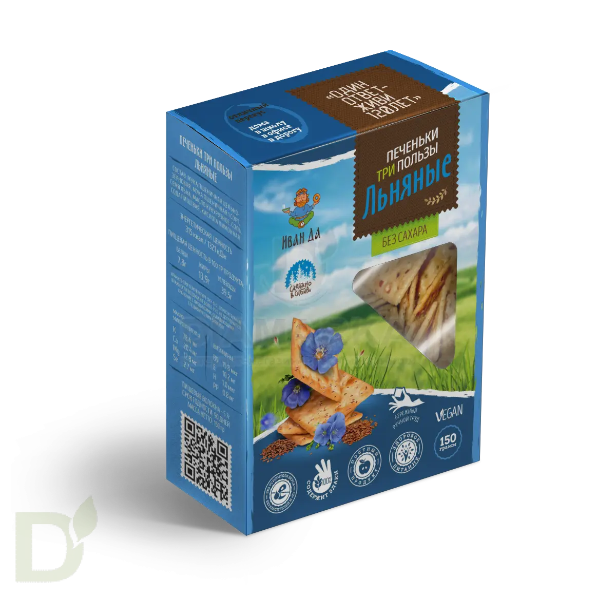 <h2>Продукты для правильного и здорового питания от Иван-ДА</h2> Компания Иван-ДА производит оригинальные и уникальные продукты, которые на все 100% соответствуют принципам здорового питания. Сырье для продукции проходит тщательный отбор, а в составе вы не найдете синтетических компонентов: все изготовлено исключительно с любовью и заботой о здоровье потребителя! Натуральность, уникальность и польза - вот главные ценности бренда.<br> <h2>Хрустящее печенье с натуральным составом</h2> Печенья Три Пользы - это бодрая хрустящесть, насыщенный и яркий вкус, питательность, сытость и польза. Ниже мы приводим подробный состав, чтобы вы могли сами убедиться в натуральности этих хрустяшек!<br> <br> Что радует: в крекерах Иван-ДА меньше углеводов, чем в обычных печеньях. Углеводы эти медленные: можно не переживать за резкий рост сахара крови после их употребления, если у вас диабет.<br> <h2>Не забудьте взять с собой</h2> Продукт послужит отличным перекусом "на скорую руку": пачечка ароматного, пряного печенья всегда должна быть наготове, на случай, если вы захотите подкрепиться.<br> <br> <b>Подходит для веганов, диабетиков, тех кто не употребляет сахар и следит за фигурой и питанием.</b><br> <br> Срок годности: 90 дней<br> Вес: 150 грамм<br> <h2>Состав печенья со льном</h2> мука 1 сорт, мука цельнозерновая, семя льна, масло растительное, соль морская, сода пищевая, лимонная кислота натуральная.<br> <h2>Пищевая и энергетическая ценность в 100 гр</h2> белки – 7,8 гр,<br> жиры – 13,9 гр,<br> углеводы – 39,5 гр.<br> пищевые волокна - 5,7 гр.<br> 315 ккал